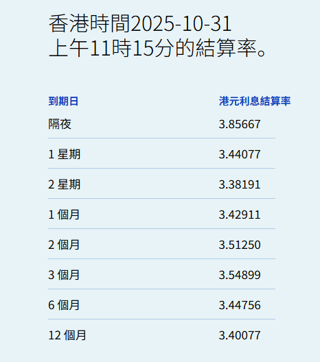 智通财经APP获悉,10月31日,港元拆息普遍向上,隔夜息报3.85667%,升78.203基点;一周拆息跌5.881基点,报3.44077%,两周则跌6.595基点,报3.38191%。与楼按相关的一个月拆息止跌回升报3.42911%,升1.375基点。