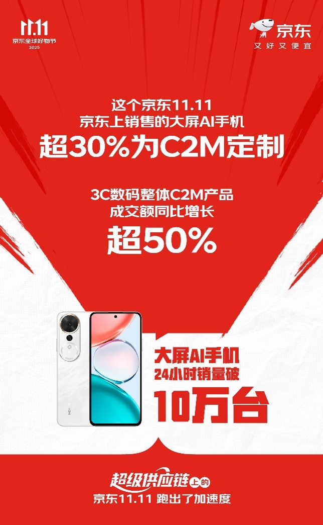 近24小时,大屏AI手机销量破10万台,搭载50系显卡的高端游戏本销量破万台,3C数码整体C2M产品成交额同比增长超50%。京东11.11期间,京东上销售的大屏AI手机超30%为C2M定制,游戏笔记本超50%为C2M定制。依托超级供应链,京东通过C2M反向定制能力构建起“需求洞察-研发生产-市场销售”的闭环链路,携手品牌共建新品,让其成为品类创新与销量增长的核心驱动力。