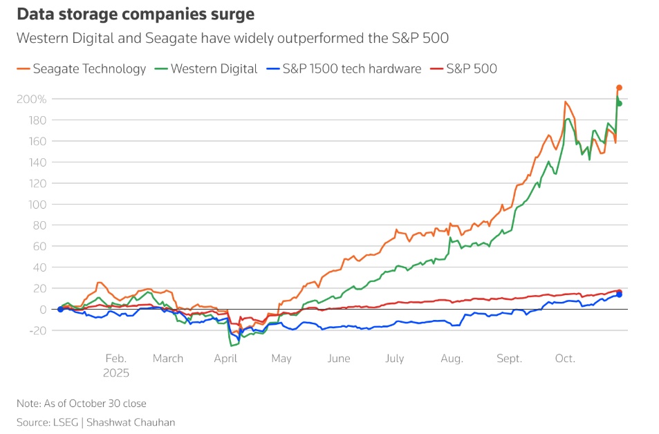 智通财经APP获悉,在全球加速扩张与AI训练/推理密切相关联基础设施的史无前例“AI算力竞赛”中,摩根士丹利等华尔街大行高呼“存储超级周期”已至,企业级存储硬盘需求激增推动了数据存储产品巨头们,比如希捷(STX.US)、闪迪(SNDK.US)和西部数据(WDC.US)的股价今年涨幅超过三位数,可谓大幅跑赢美股大盘乃至全球股票市场。