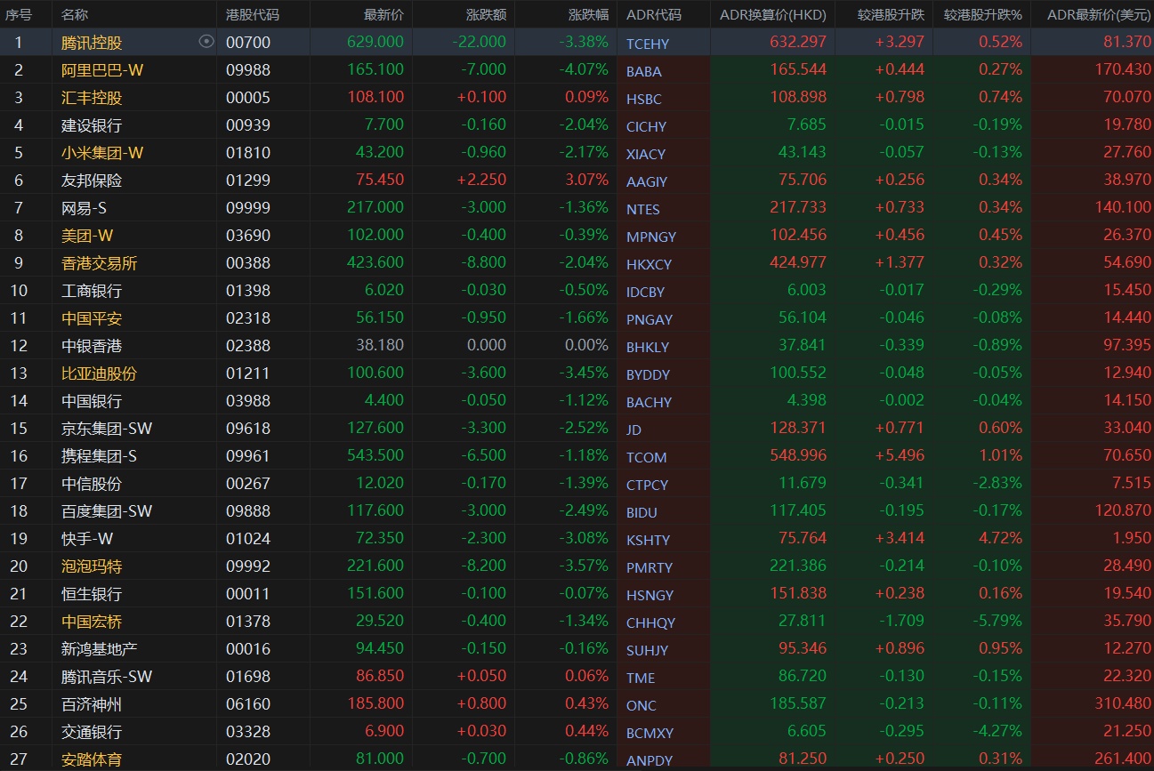 大型蓝筹股涨跌不一,汇丰控股收报108.898港元,较香港收市涨0.74%;腾讯控股收报632.297港元,较香港收市涨0.52%。