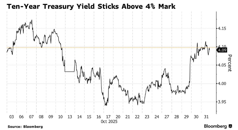 有着“全球资产定价之锚”称号的10年期美债收益率再度站稳4%以上,在周五收于4.09%,而本周初曾显著低于4%。这一走势反映了市场情绪的突然转变:与美联储12月会议挂钩的利率互换合约目前暗示12月降息概率大致五五开,而非鲍威尔发表鹰派言论前的超过90%降息概率。