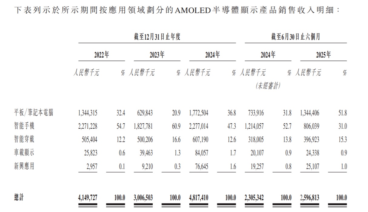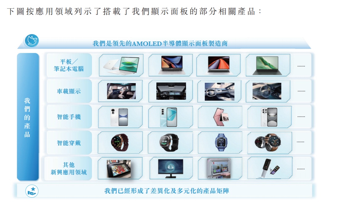 且和辉光电在多个细分领域的销量同样占据着领先的市场地位。据灼识咨询数据显示,若按2024年的销量计算,和辉光电于平板╱笔记本计算机显示面板领域位列全球第二,中国第一;在车载显示领域位列全球第四,中国第二;在智能穿戴领域,位列全球第四,中国第三;在智能手机领域,位列全球第七,中国第五。