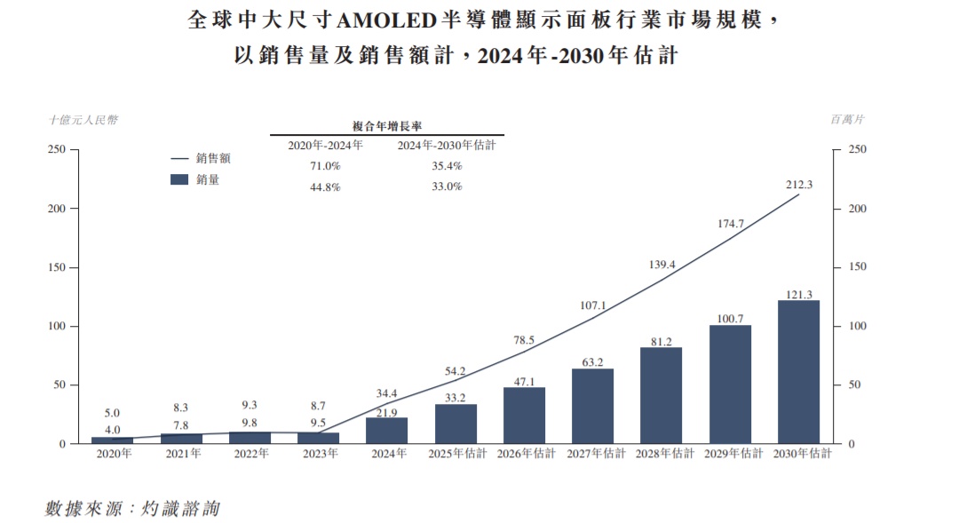 当然,和辉光电所面临的机遇也较为明显,即全球中大尺寸AMOLED半导体显示面板行业市场未来仍将高速成长。据灼识咨询数据显示,从2020至2024年中,得益于AMOLED技术从智能手机向平板电脑、笔记本电脑等中大尺寸领域的加速渗透,全球中大尺寸AMOLED半导体显示面板的市场规模从50亿人民币增至344亿元,年复合增速高达71%。