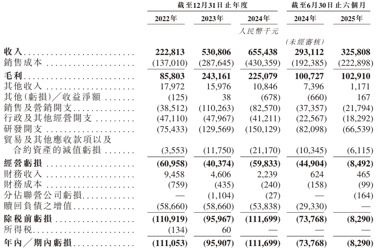 业绩方面,2022年、2023年、2024年及2025年截至6月30日止六个月,该公司实现收入分别约为2.23亿元、5.31亿元、6.55亿元、3.26亿元人民币;同期,年╱期内亏损约为1.11亿元、9590.7万元、1.12亿元、829万元人民币。