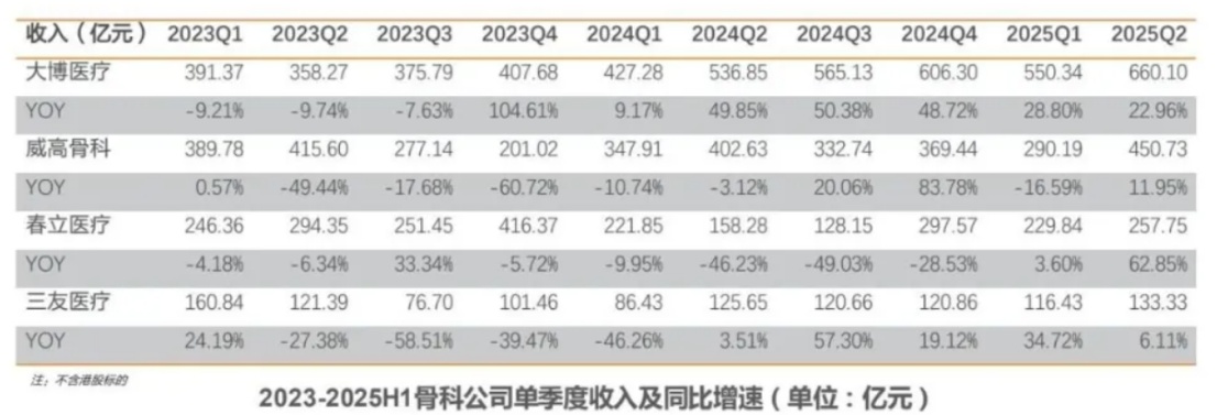 但市场似乎还是低估了国产骨科耗材行业回暖的速度。25H1季度,大博医疗和春立医疗和威高骨科的净利润增速分别达到76.69%和44.85%和52.43%;三友医疗的当期净利润更是同比增长高达2083.64%,实现了超20倍的增长;即使是稳健增长的爱康医疗,其净利润同比增速也有15.3%。