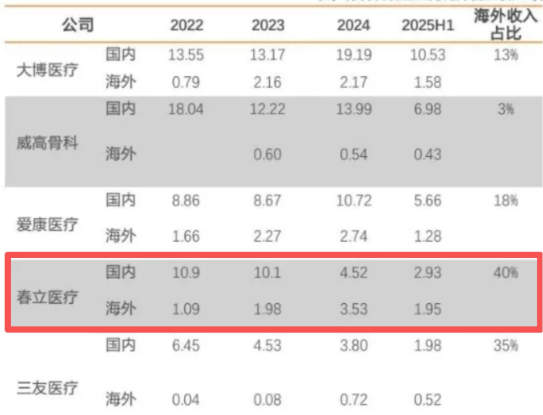 而随着公司积极开拓国际市场业务,高速增长的海外收入已成为其重要收入来源。今年上半年,春立医疗的海外收入占比已达4成。