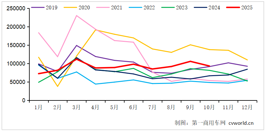 2019-2025年我国重卡市场销量月度走势图(单位:辆)