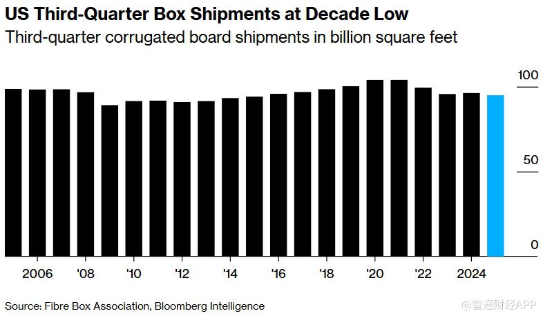 智通财经APP获悉,根据美国纸箱行业协会(Fibre Box Association)上周五公布的数据,三季度美国瓦通纸箱出货量降至2015年以来同期最低水平,延续了二季度以来的疲弱态势。包括包装材料龙头企业在内的多家公司近期均发出警告,称经济不确定性正对零售商及消费者支出造成压力。