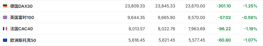 2. 截至发稿,德国DAX指数跌1.25%,英国富时100指数跌0.59%,法国CAC40指数跌1.19%,欧洲斯托克50指数跌1.07%。