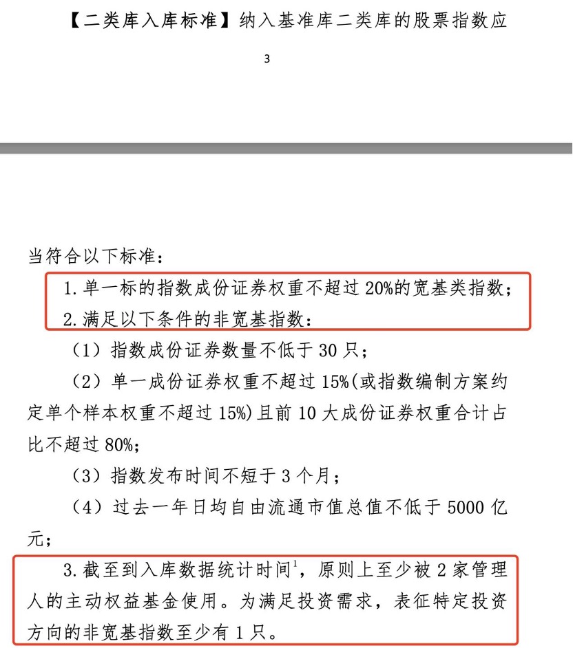 再看二类库,该层库纳入指数更多,为72只,入库标准则相对宽松,符合单一标的指数成份证券权重不超过20%的宽基类指数、满足指数成份证券数量不低于30只等条件以及被2家基金公司主动管理基金使用即可。