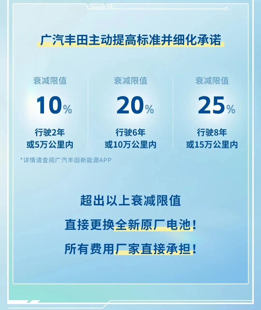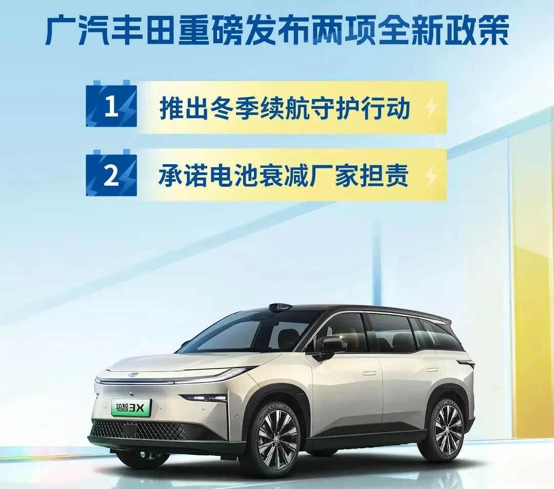 从行业首次为电池自燃和智能泊车事故担责,到本次新增电池衰减厂家担责,广汽丰田双担责政策正式升级为厂家三担责,再次树立行业新标杆。围绕消费者关注新能源汽车使用核心痛点,不推脱,快响应,彻底兜底,以技术底气下的重磅服务承诺,为用户安心用车全程护航。