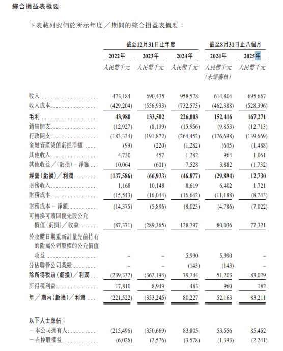于2022年及2023年,卓正医疗录得净亏损分别人民币2.22亿元及人民币3.53亿元。然而,该公司于2024年及截至2025年8月31日止八个月年内利润分为约为人民币8022.7万元及人民币8321.1万元。