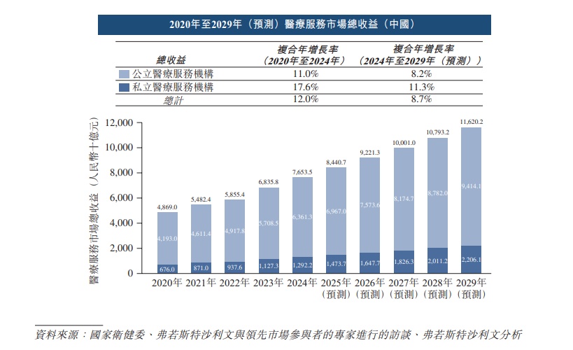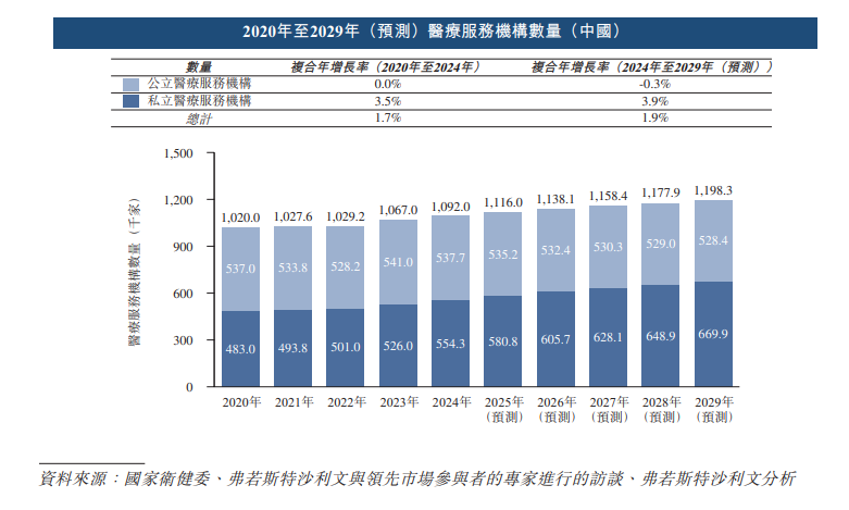 据招股书披露,截至2024年底,中国共有医疗服务机构109.20万家。按所有制类型划分,医疗服务机构可分为公立医疗服务机构及私立医疗服务机构。 2020年至2024年,中国公立医疗服务机构数量从53.70万家略增至53.77万家,而私立医疗服务机构数量从48.30万家增至55.43万家,复合年增长率为3.5%。预计2024 年至2029年,中国公立医疗服务机构的数量将从53.77万家下降至52.84万家,而私立医疗服务机构的数量将继续增长,从55.43万家增长至66.99万家,复合年增长率为 3.9%。