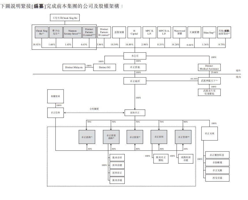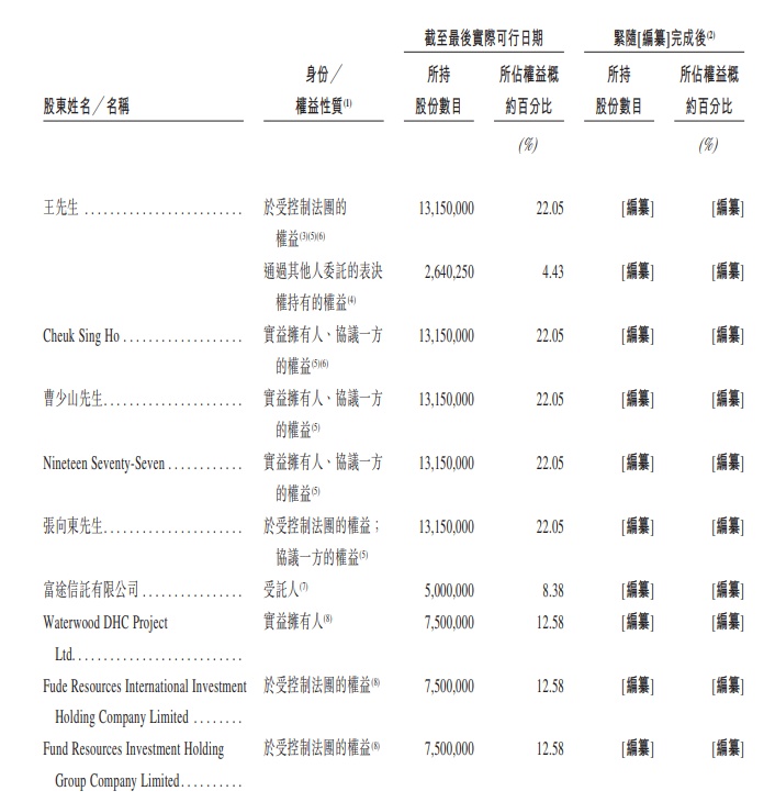 招股书显示,Cheuk Sing Ho有七名股东,即王志远先生、另外两名董事施翼先生及张向东先生、两名高级管理层朱岩医生及周方先生以及另外两名个人张东生先生及赵瑜女士,彼等分别持有39.1%、 18.4%、2.2%、9.2%、5.1%、1.1%及24.9%的股权。根据Cheuk Sing Ho协议,王志远先生(作为Cheuk Sing Ho的唯一董事)拥有就该公司所有事宜代表Cheuk Sing Ho作出决定及投票的唯一权利及权力。王志远先生及Cheuk Sing Ho将成为该公司的控股股东。