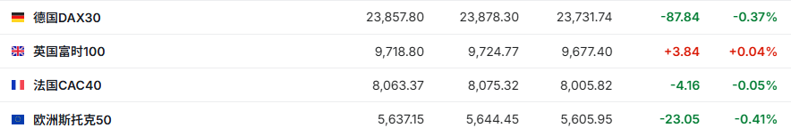 2. 截至发稿,德国DAX指数跌0.37%,英国富时100指数涨0.04%,法国CAC40指数跌0.05%,欧洲斯托克50指数跌0.41%。