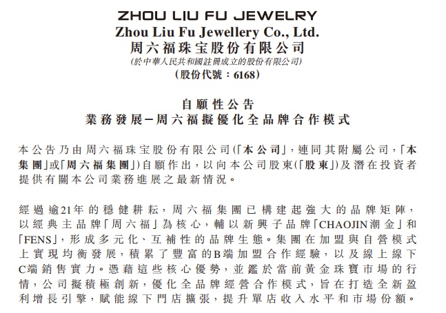 在治理结构上,联营实体全面引入现代企业制度,设立规范的董事会与管理团队,实现“类子公司化”运营。这一安排使周六福能够系统输出其成熟的管理体系、数字化工具与品牌标准,实现对终端运营质量的精准把控;同时,保留加盟商在区域资源整合与本地化经营方面的灵活性,形成“标准化与适应性”并重的运营优势。正如公告所指,该模式实现了“品牌授权、批发业务、线上线下零售收益”等多重利润来源的共享,体现了企业化治理下的价值整合与分配机制。