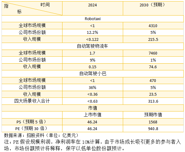 以PS的5倍估值算,文远知行将在2030年估值达到1568亿美元,相比于上市估值溢价达33.9倍,预期PE值50倍。参照科技股的成长案例,PS估值普遍超过10倍,该公司估值预测略显保守,比如寒武纪的PS值达到471倍,英伟达37倍,特斯拉达15.6倍。