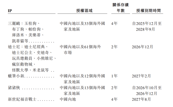 招股书显示,TOP TOY搪胶毛绒品类最畅销IP三丽鸥系列的授权2028年9月到期,“迪士尼”和“猪猪侠”的到期时间均为2026年12月,“蜡笔小新”及“新世纪福音战士”的到期时间都在2027年。