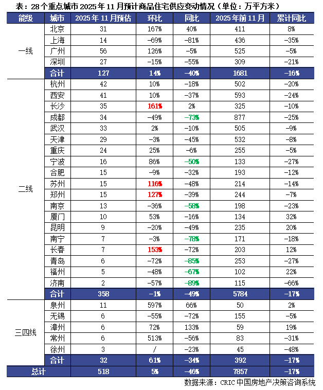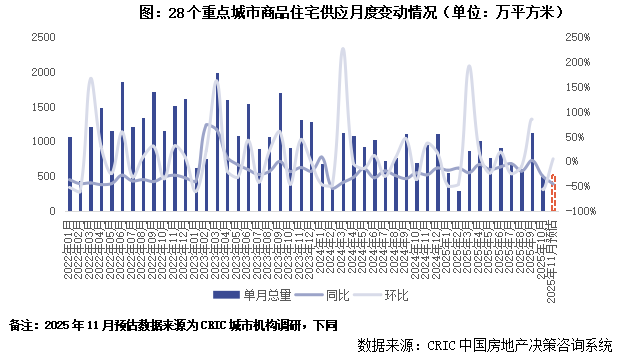 11月房企推盘积极性小幅回升,供给约束依旧显著:据CRIC调研,11月28城预计新增商品住宅供应面积518万平方米,环比微增5%,同比下跌46%,2025年前11月累计同比下降17%。