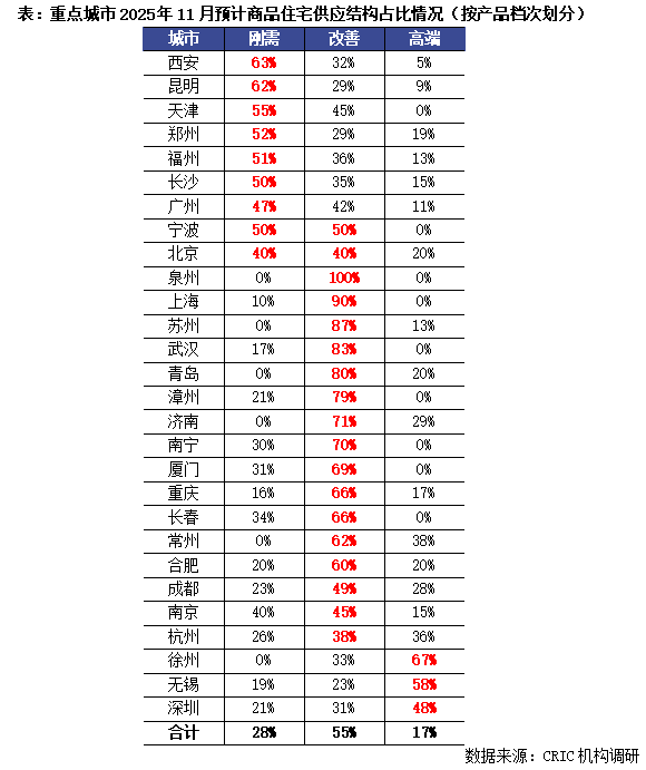 而从供应结构各产品档次分布来看,市场持续向改善需求倾斜:重点城市刚需、改善、高端占比结构为28%、55%和17%,呈现出以改善为主,刚需为辅的供应结构。
