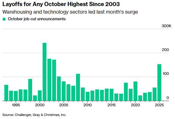 10月全美企业宣布裁员153,074人,几乎是去年同期的三倍,比2024年10月宣布的55,597人裁员增加了175%,比一个月前宣布的54,064人裁员增加了183%。此次裁员主要集中在科技和仓储物流行业。这是自2003年手机普及引发行业变革以来,10月单月裁员人数的最高纪录。