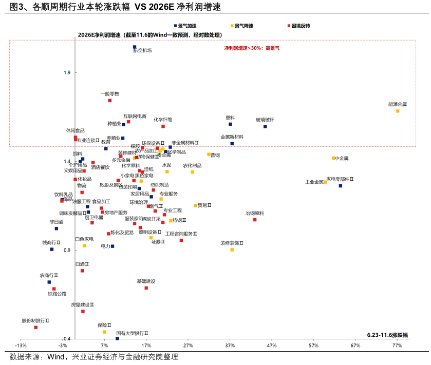 明年高景气(预期净利润同比增速>30%)且景气加速:包括航空机场、建材(玻璃玻纤、塑料、非金属材料)、金属新材料、农业(种植业、养殖业)等。