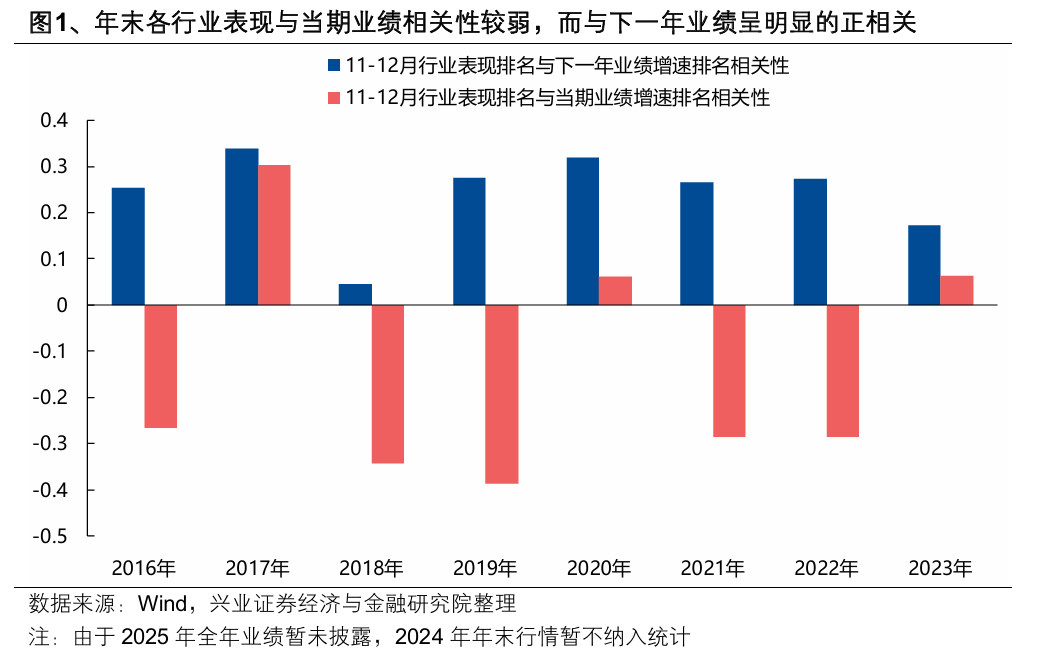 智通财经APP获悉,兴业证券发布研究报告称,随着年末市场提前抢跑定价下一年景气,景气预期变得更加重要,而当期景气对股价的影响减弱。复盘自2016年以来的年末行情(11-12月),从后验视角来看,各行业表现排名与其下一年业绩增速呈现较强的正相关,而与当期的业绩增速相关性较弱、甚至呈现负相关。从这个角度来看,投资者往往在年底寻找下一年景气更占优的行业提前进行布局,核心是寻找下一年强者恒强或者困境反转的方向。根据一致预期,明年高景气或困境反转具备弹性、本轮涨幅偏低的科技成长行业集中在AI中下游、军工、医药、汽车、部分新能源产业链等:顺周期行业集中在钢铁、化工、建材、新消费&服务消费、农业等。