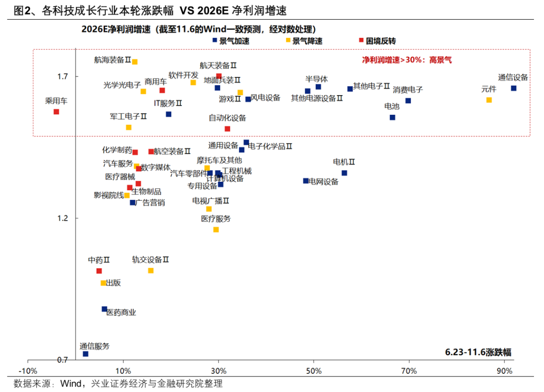 明年高景气(预期净利润同比增速>30%)且景气加速:包括AI硬件(通信设备、消费电子、半导体)、新能源(电池、风电设备)、军工(地面兵装)、计算机(IT服务),其中风电设备、地面兵装、IT服务本轮涨幅偏低。