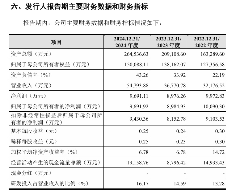 财务方面,于2022年度、2023年度及2024年度,公司实现营业收入分别约为人民币3.22亿元、3.68亿元、5.48亿元;同期,公司净利润分别为人民币9972.83万元、8976.26万元、9691.11万元。