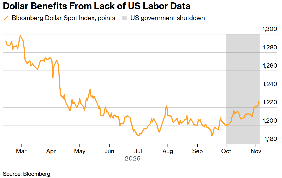 10月份,在政府停摆导致经济数据发布停滞的情况下,美元录得今年第二大的月度涨幅。