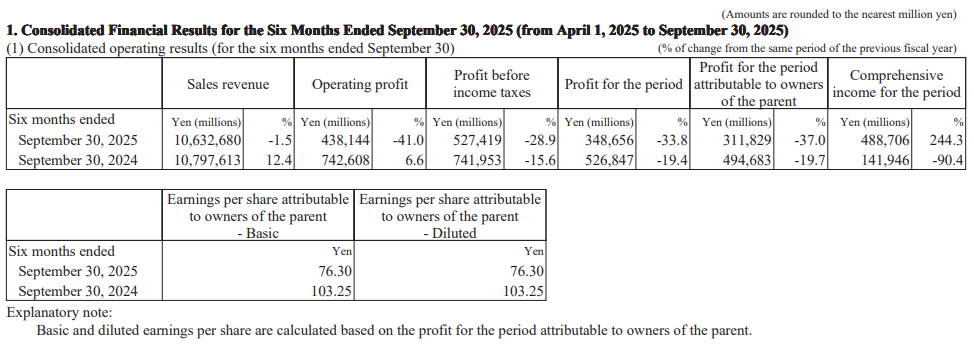 截至2025 年9月30日的六个月期间,其盈利也大幅下滑,原因是全球需求疲软以及成本上升对利润造成了影响。该公司归属于母公司所有者的综合利润同比下降37%,至 3118 亿日元(约合 20.3 亿美元)。该期间的每股摊薄盈利为 76.30日元人民币,较上年同期的 103.25日元大幅下降。营业利润同比下降 41%至 4381 亿日元,这反映了原材料成本上升以及主要出口市场复苏缓慢所带来的压力。