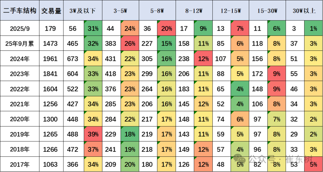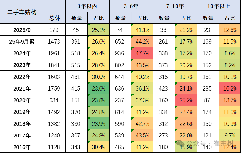 二手车的次新车交易表现较强,主要也是新能源车成为二手车的组成。二手车的交易结构目前来看:高车龄的二手车逐步增多,2025年1-9月总体占比达到11.5%的比例,而3-6年达到44.2%的比例,增长比较突出,两者比例都是相对较高的。