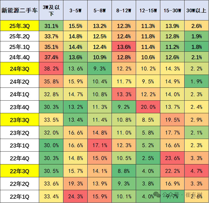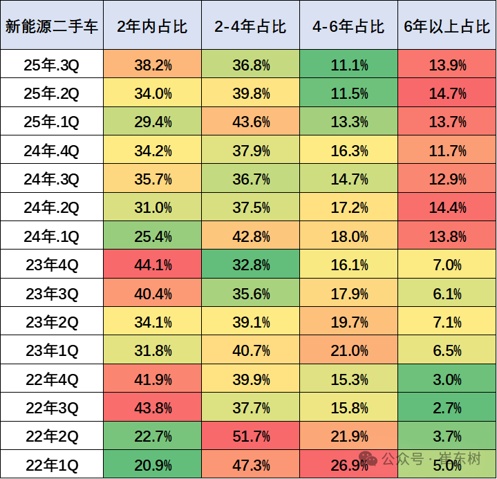 2025年3季度,全国新能源二手车使用年限在2年以下的占比38.2%,较去年同期小幅提升。