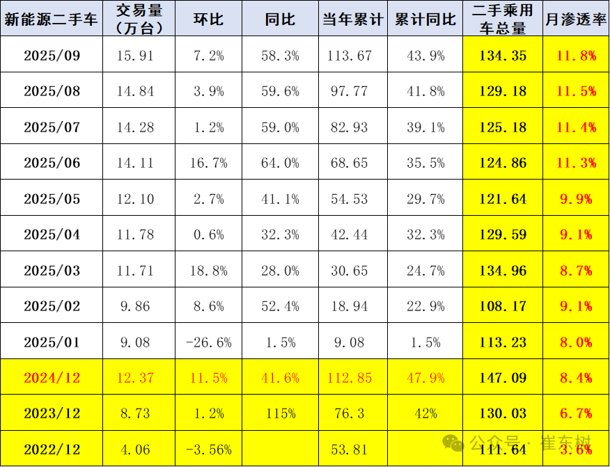 随着新能源车市场的新车销量爆发增长,新能源二手车的保有量规模也在不断增大,随之而来新能源车的二手车渗透率不断提升,从2022年底的渗透率3.6%,上升到2025年9月的11.8%,相对于新能源车保有量的占比,二手新能源车的交易占比基本是同步增长。未来随着新能源车的高速增长和价格逐步趋稳,新能源二手车的发展潜力巨大。