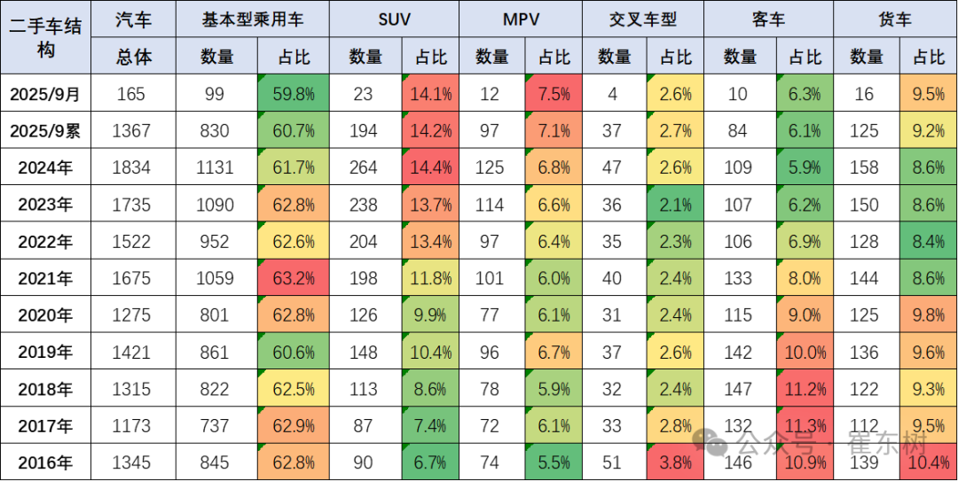 二手车市场的格局呈现SUV、MPV市场持续增长,而客车市场相对萎缩的局面。由于轿车占比过高,目前二手车市场结构总体与新车均向SUV和MPV的消费高端化发展。