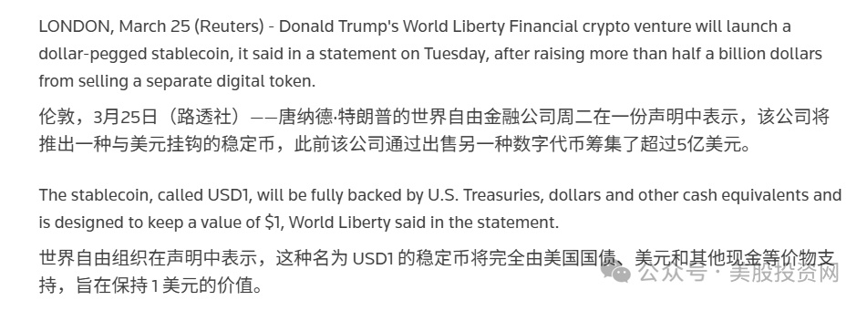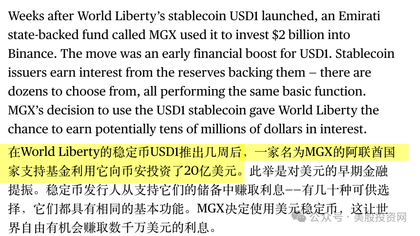 2025年5月,阿布扎比国有投资公司MGX以20亿美元购买USD1稳定币,使其迅速跻身全球前十大稳定币之一。据估算,特朗普家族通过这一交易赚取了超过5000万美元的收益。