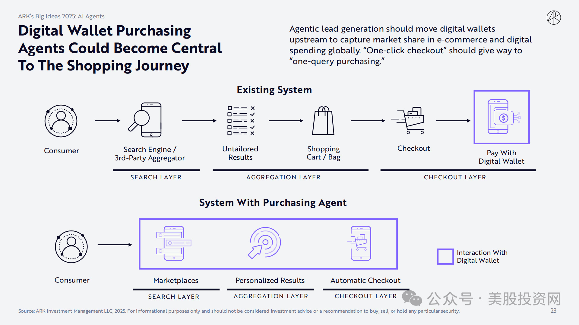 这就是ARK Invest的“木头姐”在会议上提到的“Agent商业”概念。简单来说,Agent商业意味着金融执行的转变:过去是人操作系统,现在是系统根据规则自动执行任务。