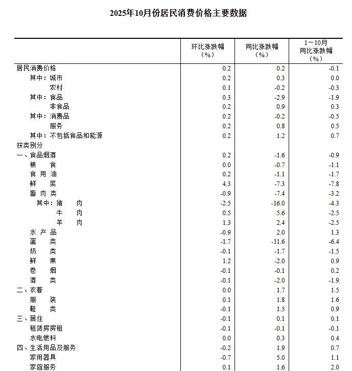 智通财经APP获悉,11月9日,据国家统计局,2025年10月份,全国居民消费价格同比上涨0.2%。其中,城市上涨0.3%,农村下降0.2%;食品价格下降2.9%,非食品价格上涨0.9%;消费品价格下降0.2%,服务价格上涨0.8%。1—10月平均,全国居民消费价格比上年同期下降0.1%。10月份,全国居民消费价格环比上涨0.2%。其中,城市上涨0.2%,农村上涨0.1%;食品价格上涨0.3%,非食品价格上涨0.2%;消费品价格上涨0.2%,服务价格上涨0.2%。