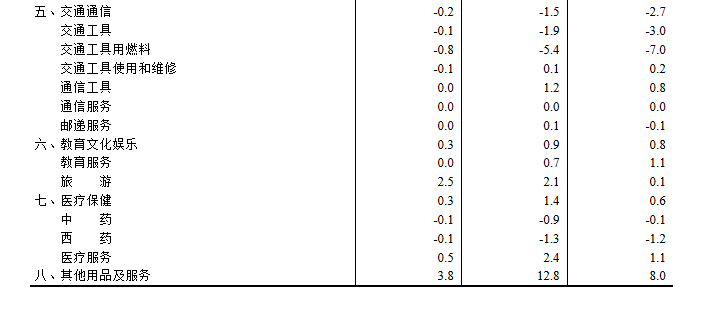 其他七大类价格同比六涨一降。其中,其他用品及服务、生活用品及服务、衣着价格分别上涨12.8%、1.9%和1.7%,医疗保健、教育文化娱乐、居住价格分别上涨1.4%、0.9%和0.1%;交通通信价格下降1.5%。