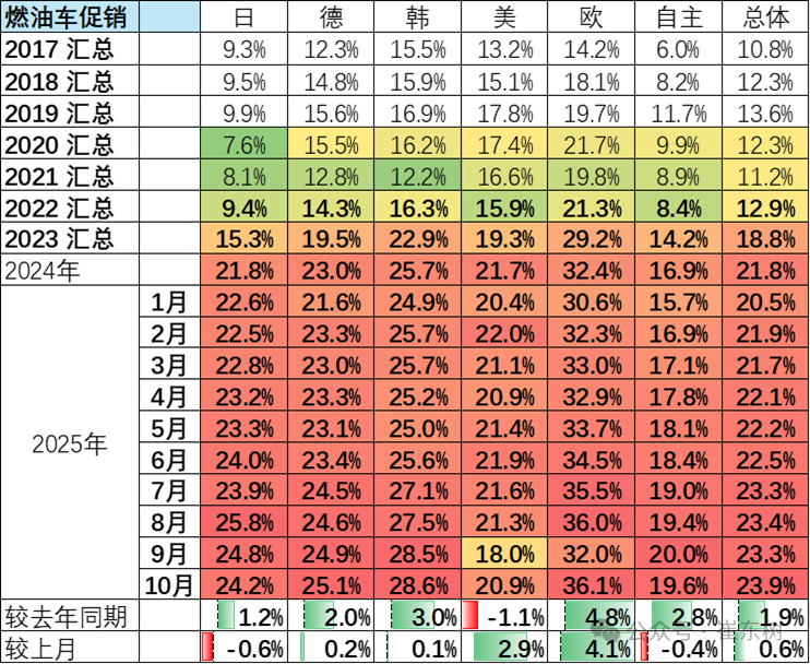 由于自主的新能源较强,2025年自主燃油车促销逐步较大,10月促销上升到18.8%,总体平稳。