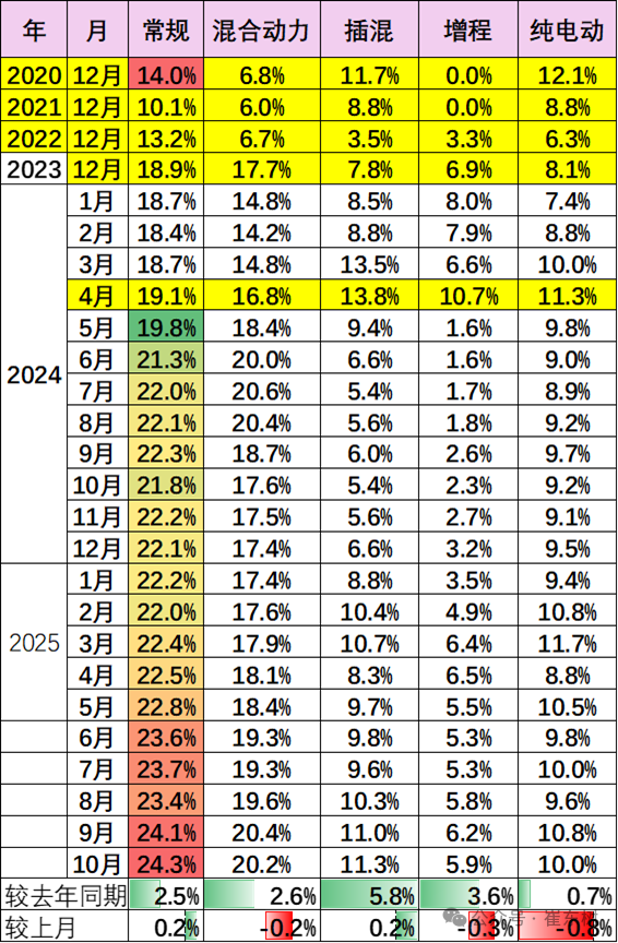 2025年初的常规燃油车和混合动力的促销压力较小,而新能源的促销相对激烈,纯电动10月促销环比9月减少。今年插电混合动力促销波动较大,10月同比上升5.8个点的促销,环比增加0.2个百分点;纯电动总体较2024年10月增加0.7个点左右的促销,较上月减少0.8个点左右的促销;增程车型总体较2024年10月增加3.6个点左右的促销。