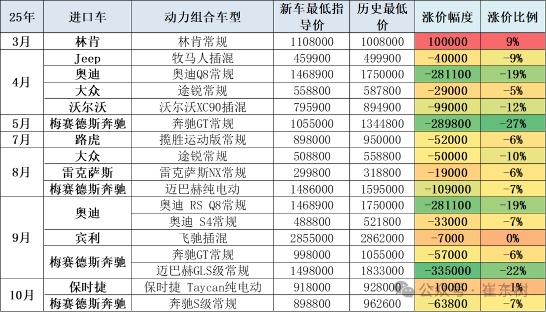 由于中美关税战,关税变化带来车价变化,3月有个别涨价车型。目前4-10月进口车没有因为关税带来的涨价车型出现,降价车型逐步出现。