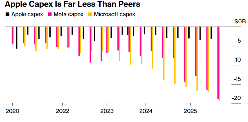 “从资金投向以及杠杆程度来看,苹果是在‘七大科技巨头’(即Mag7)中对AI算力开支敞口最小的一家巨头。”来自Evercore的投资组合经理兼投资政策委员会主席Brian Pollak表示。“它绝对有可能成为AI浪潮的最核心受益者,尤其是即将风靡全球的‘物理AI’,并且苹果不必投入与谷歌、微软等科技巨头们一样大规模的资本开支。”