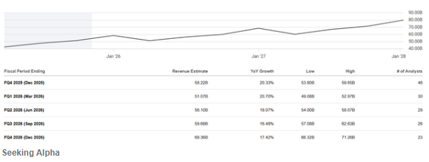 营收方面,2025年第三季度营收达512.4亿美元,同比增长26%。管理层预计第四季度营收为560-590亿美元。华尔街预测,未来两个季度Meta营收同比增速仍将超过20%,之后才会有所放缓。