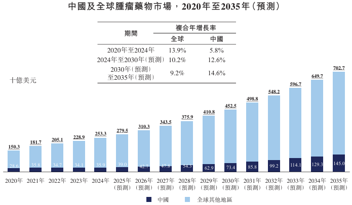 中国肿瘤药物市场从2020年的286亿美元增长至2024年的359亿美元,复合年增长率为5.8%,预计到2030年将增长至734亿美元,到2035年将增长至1,450亿美元,其中2024年至2030年的复合年增长率为12.6%,2030年至2035年的复合年增长率为14.6%。