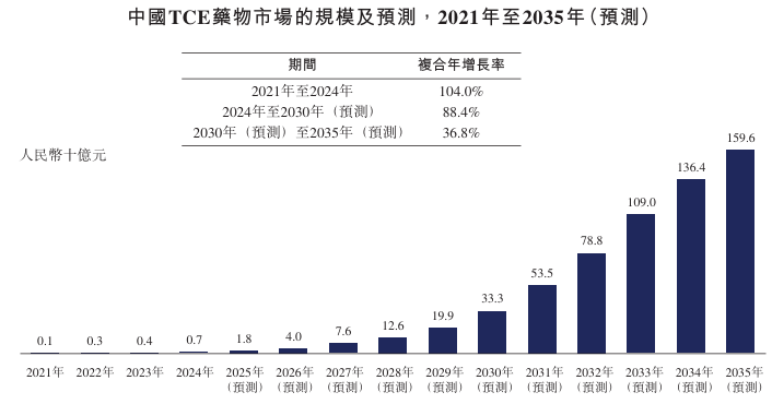 中国TCE药物市场在2021年规模达人民币1亿元,至2024年已增长至人民币7亿元,2021年至2024年的复合年增长率为104.0%。预计到2030年,该市场规模将进一步扩大至人民币333亿元,2024年至2030年的复合年增长率为88.4%。到2035年,中国TCE药物整体市场有望达到人民币1,596亿元。