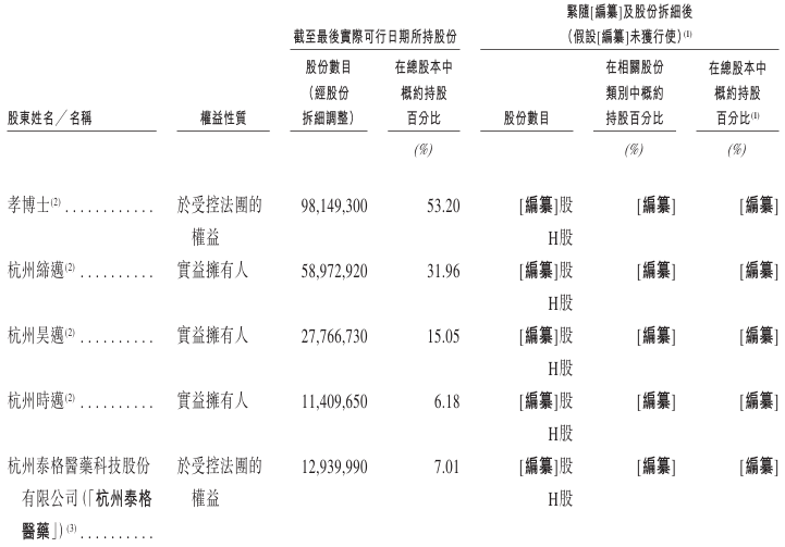 杭州时迈于2020年10月29日在中国成立为有限合伙企业,拥有11,409,650股公司股份(经股份拆细调整),占截至本文件日期已发行股份约6.18%。杭州时迈由孝博士作为其唯一普通合伙人控制。截至本文件日期,杭州时迈由孝博士作为其普通合伙人拥有约1.41%,余下98.59%(对应于11,248,950股股份(经股份拆细调整))由 2025年股权激励计划下的相关承授人作为有限合伙人拥有,即(i)周东文博士(执行董事,持有约32.34%合伙权益)及刘扬博士(首席财务官及董事会秘书,持有约32.34%合伙权益),及(ii)并非董事、高级管理层或公司关连人士的其他8名雇员(合共持有约33.91%权益,其各自合伙权益约为1.62%至8.87%)。