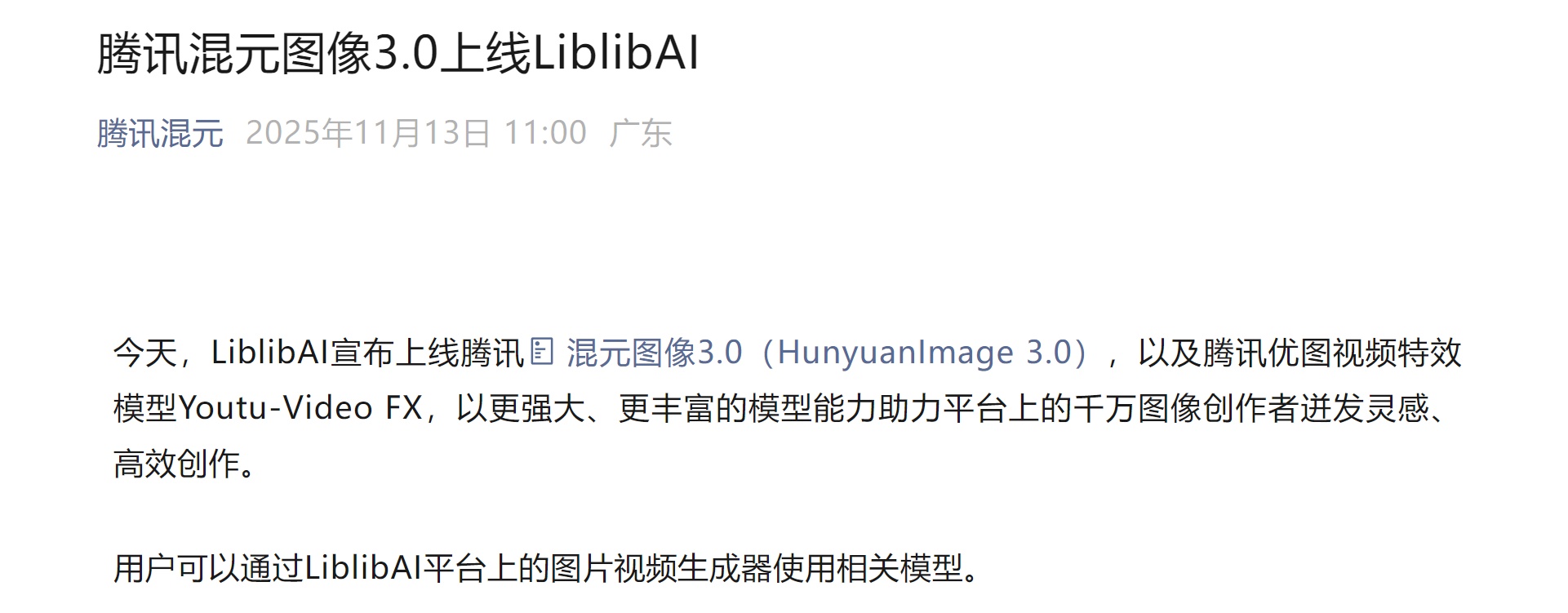 智通财经APP获悉,11月13日,据腾讯混元官微消息,LiblibAI宣布上线腾讯混元图像3.0(HunyuanImage