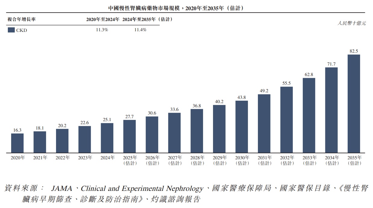 从行业来看,维健医药两大核心赛道均具有一定的前景。根据灼识咨询报告,中国CKD(肾脏损伤)治疗市场保持双位数的增速,一方面患者人数仍持续的上升,近五年复合增速0.4%,另一方面价格端不断上涨,导致行业规模持续扩大,2024年中国CKD药物市场规模251亿元,复合增速11.3%,预计到2035年将达到825亿元。