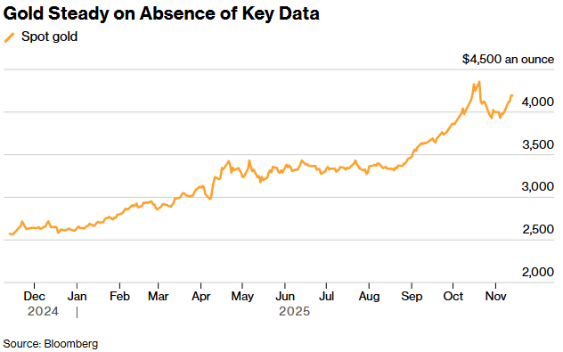 在美国总统特朗普签署法案结束有记录以来最长的政府停摆后,黄金价格逼近每盎司4215美元,连续第五个交易日攀升。然而,白宫已警告称,10月份的官方就业和通胀数据不太可能发布。